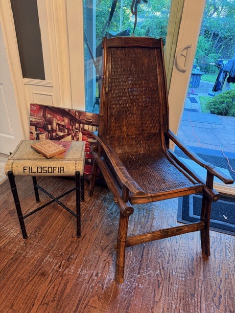 - Rustic wood bench; handmade wood + wicker lounge chair