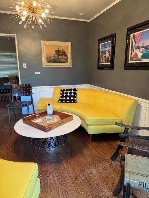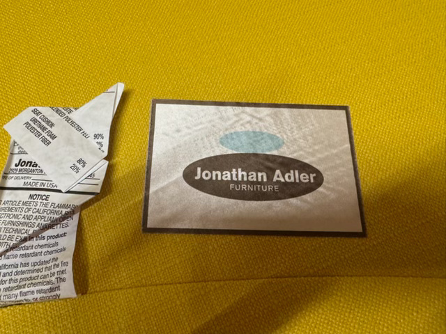 - Jonathan Adler mustard curved sofa, circular coffee table, shearling bench